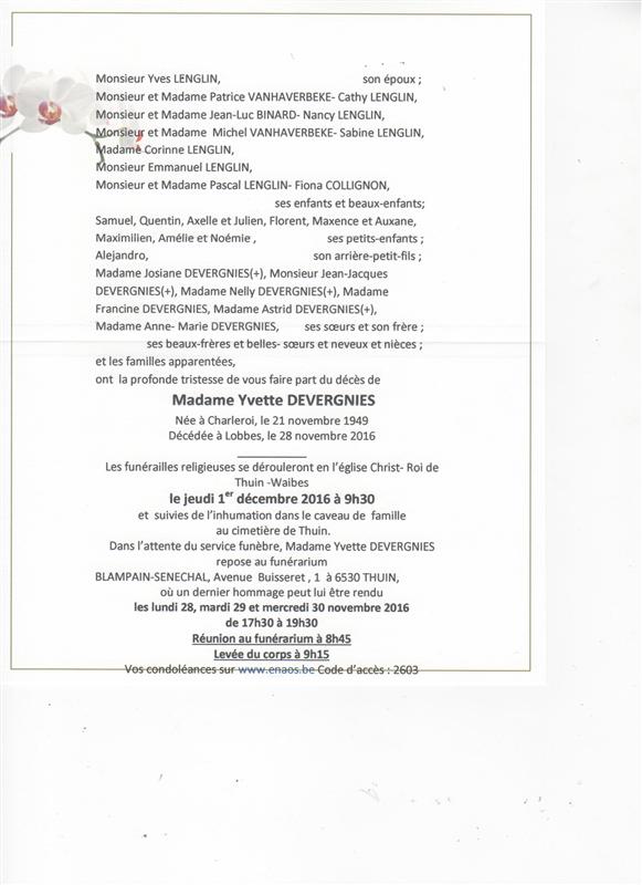Décédée à Lobbes (6540) le lundi 28 novembre 2016 à l'âge de 67 ans