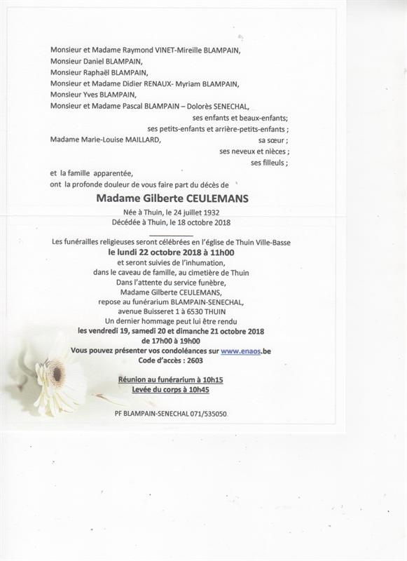 Décédée à Thuin (6530) le jeudi 18 octobre 2018 à l'âge de 86 ans