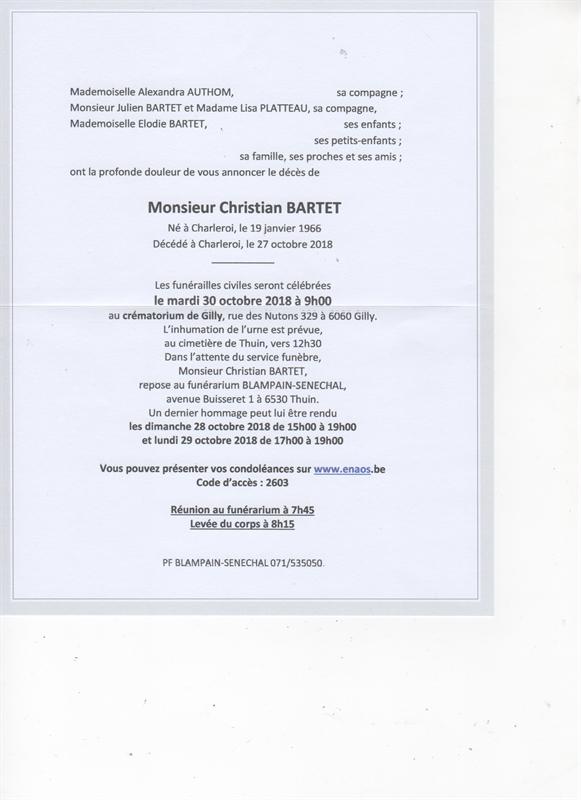 Décédé à Charleroi (6000) le samedi 27 octobre 2018 à l'âge de 52 ans