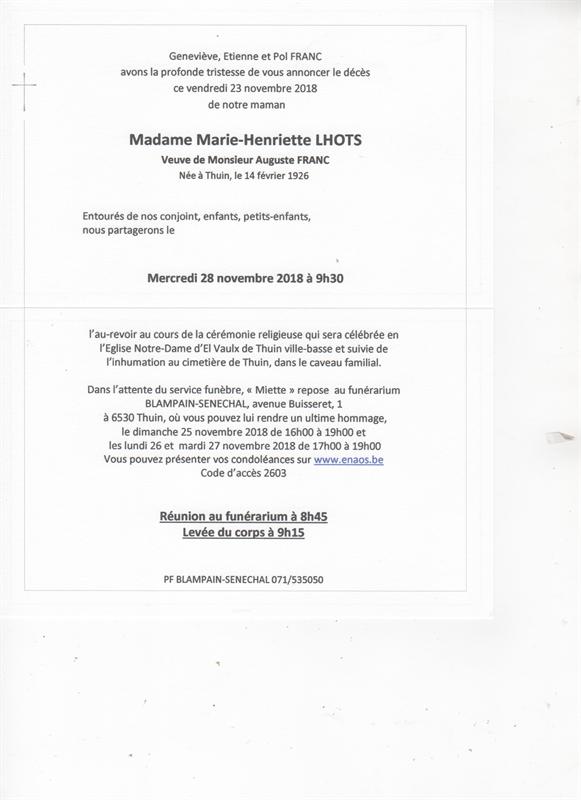 Décédée à Thuin (6530) le vendredi 23 novembre 2018 à l'âge de 92 ans