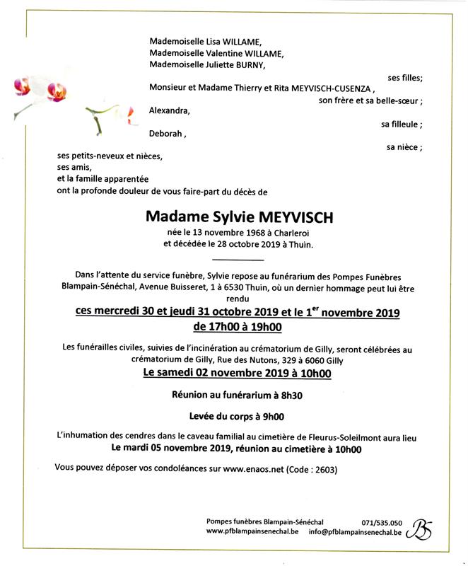 Décédée à Thuin (6530) le mardi 29 octobre 2019 à l'âge de 50 ans