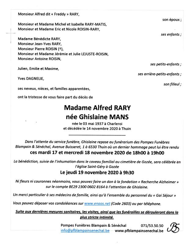 Décédée à Thuin (6530) le samedi 14 novembre 2020 à l'âge de 83 ans