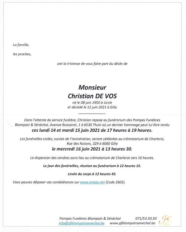 Décédé à Gilly (6060) le samedi 12 juin 2021 à l'âge de 71 ans