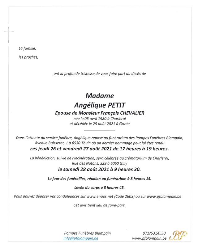 Décédée à Gozée (6534) le mercredi 25 août 2021 à l'âge de 41 ans
