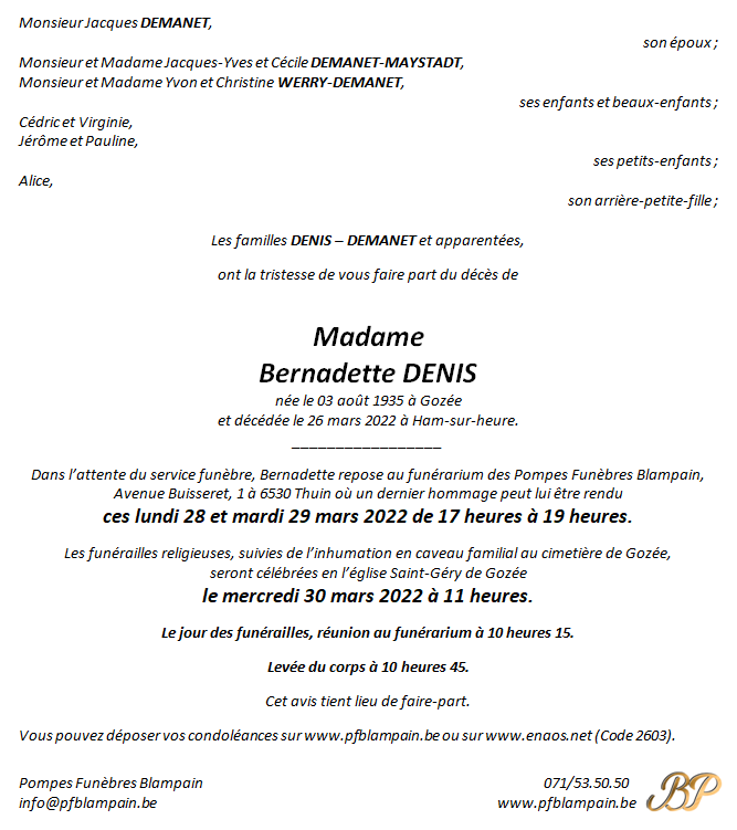 Décédée à Ham-sur-Heure (6120) le samedi 26 mars 2022 à l'âge de 86 ans
