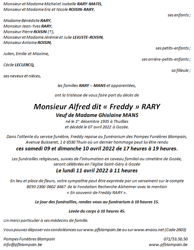 Décédé à Gozée (6534) le jeudi 7 avril 2022 à l'âge de 86 ans