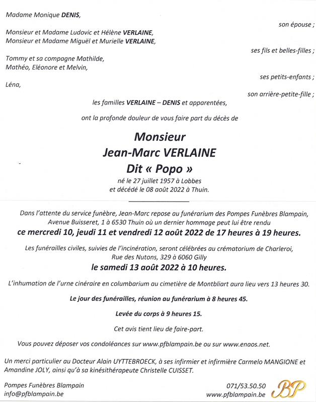 Décédé à Thuin (6530) le lundi 8 août 2022 à l'âge de 65 ans