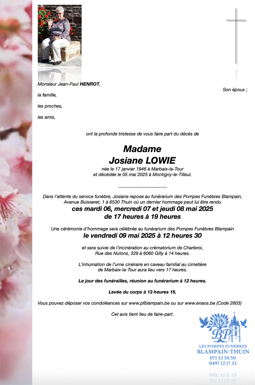 Décédée à Montigny-le-Tilleul (6110) le lundi 5 mai 2025 à l'âge de 79 ans