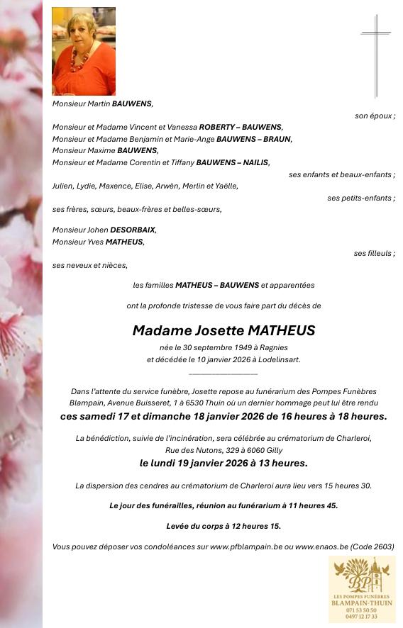 Décédée à Lodelinsart (6042) le samedi 10 janvier 2026 à l'âge de 76 ans