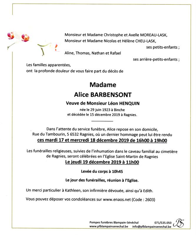 Décédée à Ragnies (6532) le dimanche 15 décembre 2019 à l'âge de 96 ans