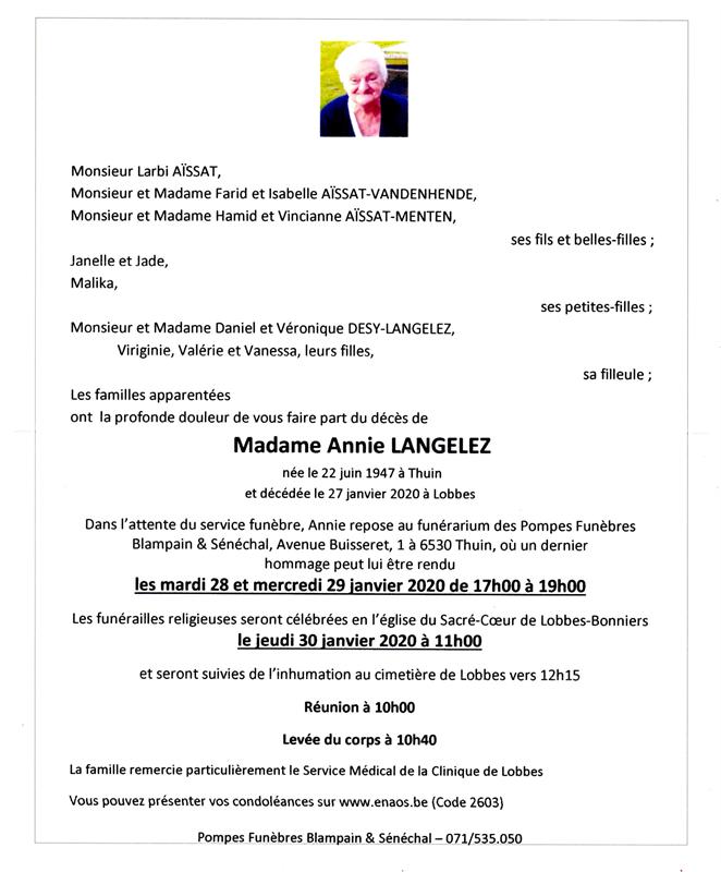 Décédée à Lobbes (6540) le lundi 27 janvier 2020 à l'âge de 72 ans