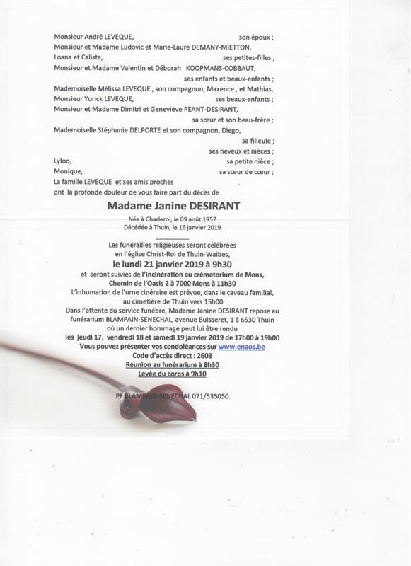 Décédée à Thuin (6530) le mercredi 16 janvier 2019 à l'âge de 61 ans