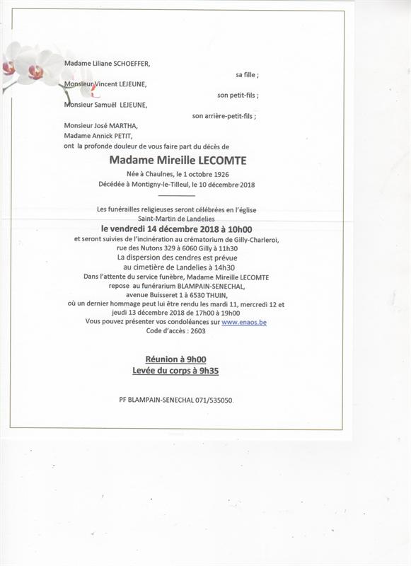 Décédée à Montigny-le-Tilleul (6110) le lundi 10 décembre 2018 à l'âge de 92 ans