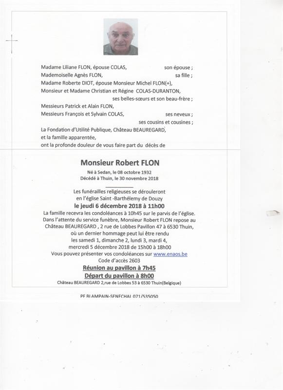Décédé à Thuin (6530) le vendredi 30 novembre 2018 à l'âge de 86 ans