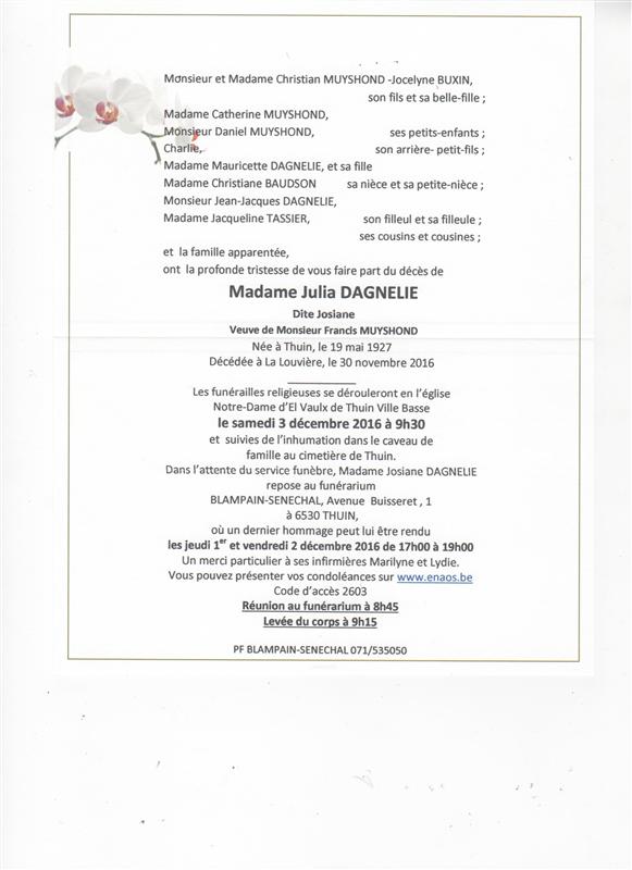 Décédée à La Louvière (7100) le mercredi 30 novembre 2016 à l'âge de 89 ans